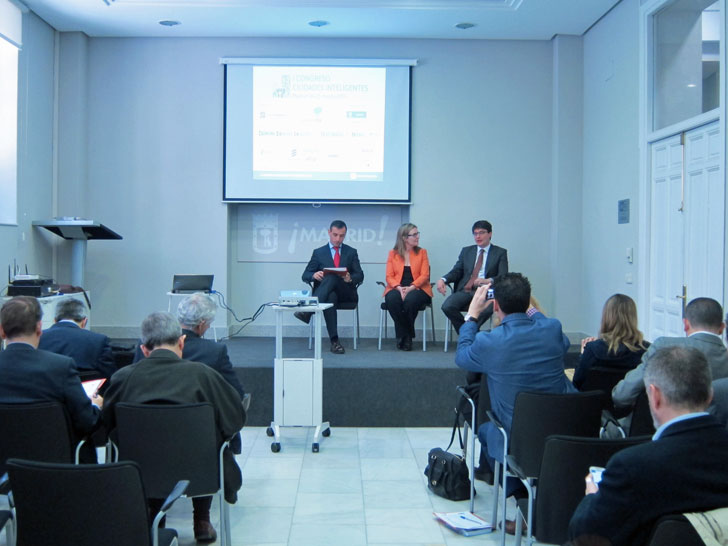 De izquierda a derecha, Pedro González Torroba, Madrid Emprende-Ayuntamiento de Madrid y José Antonio Teixeira Vitienes, Director de Innovación del Ayuntamiento Santander en representación de la RECI; Inés Leal, Directora del I Congreso Ciudades Inteligentes en Grupo Tecma Red.